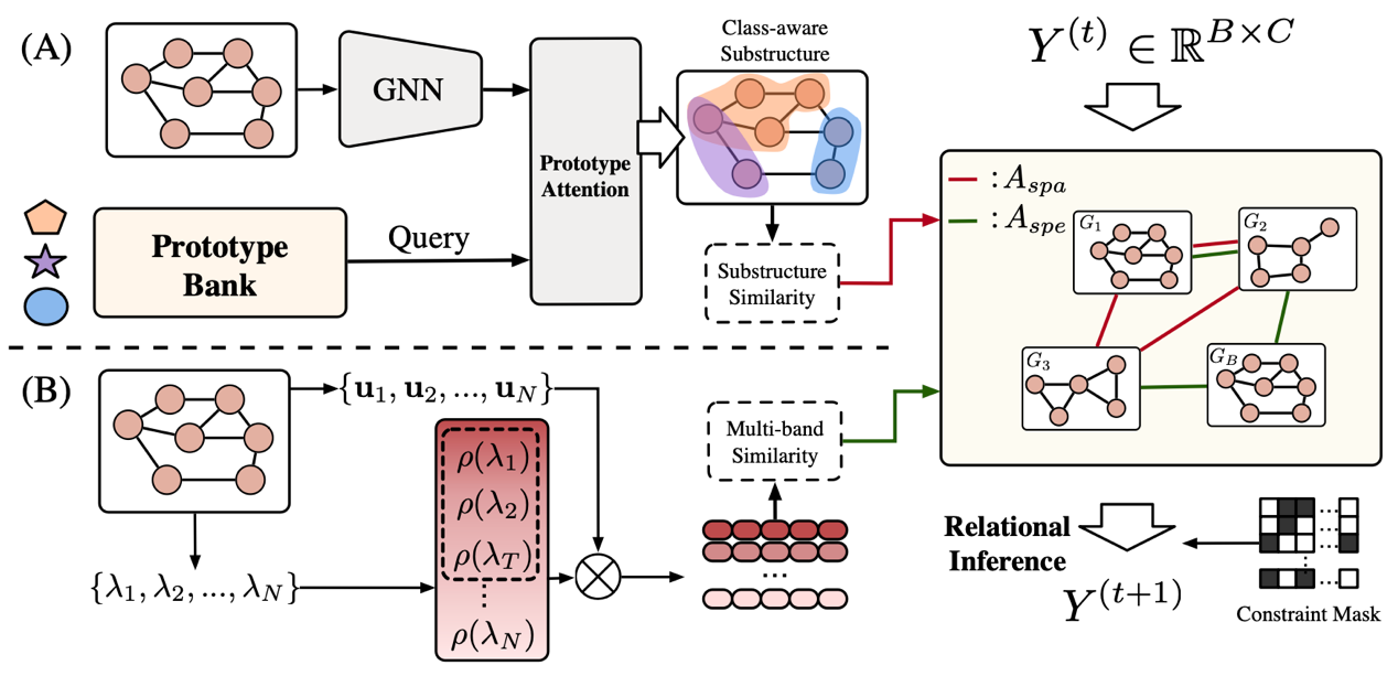 在真实世界的图学习任务中,精确标注往往代价高昂甚至不可行,模糊或带有歧义的监督成为常态。针对这一关键挑战,本文提出 PRISM:一个面向部分标签图学习的统一关系推断框架。PRISM 从结构与频谱两个互补视角出发,通过原型引导的判别性子结构对齐捕捉关键空间线索,并利用多频带谱分解与注意力机制建模全局结构语义,在候选标签约束下构建混合关系图,实现置信度感知的标签传播与改进。无需真实标签或额外辅助信号,PRISM 即可在高度噪声与强歧义监督条件下稳定学习可靠语义表示。大量不同领域的图基准实验表明,PRISM 在不同噪声水平下均显著优于现有方法,展现出卓越的鲁棒性与泛化能力,为弱监督图分类提供了一种多视角驱动的通用新范式。
