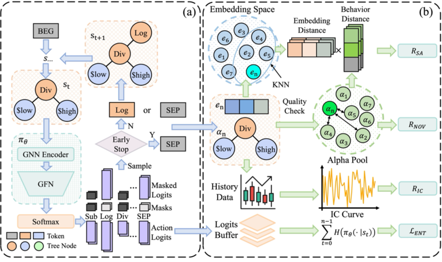 2.GFlowNet挖掘框架:引入生成流网络学习覆盖多峰解空间的采样分布,避免RL单峰收敛带来的同质化,支持生成多样、低相关的alpha候选集合。