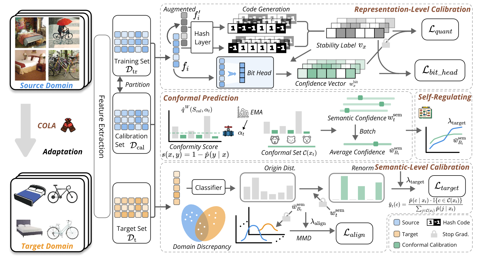 在现实的大规模检索任务中,模型常面临域偏移挑战,导致在目标域上表现出盲目自信且容易被噪声误导。本文提出了一种名为COLA的全新框架,首次将具有严谨统计保证的共形预测引入无监督域自适应散列领域。
